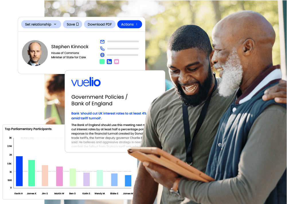 Whether your goal is to anticipate risk, shape policy, or strengthen stakeholder engagement, get in touch to learn how Vuelio can help you keep one step ahead of the political agenda.